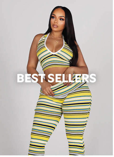Striped ribbed knit halter top & flare pants set Open back design with adjustable tie straps High-waist ribbed knit foldover flare pants Top Length 15"(Size S) Pants Length 42" / Inseam 30"(Size S) Slip on closure Runs true to size...