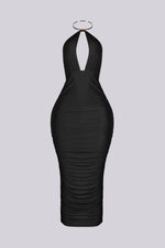 Metal choker midi dress featuring a front V cutout and ruched detailing Length 47"(S) Slip on closure We recommend wearing pasties or no bra with this garment Runs true to size Please note: Colour may vary due to lighting on...