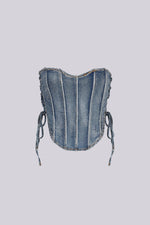 Denim bustier top featuring boning, side lace up, and all over rhinestones Length 12"(S) Lace up closure We recommend wearing pasties, a strapless bra, or no bra with this garment Runs true to size Please note: Colour may vary due...