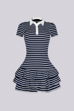 Button up striped mini dress with a classic collared neckline and slim fit Layered tiered hem adds subtle volume and movement Length: 32.5" (Size S) Slip on closure We recommend wearing pasties or going braless with this style Runs true...