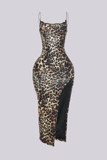 Sleeveless mesh leopard print cami midi dress featuring all over rhinestone embellishments and a lace side slit Fully lined Length 48.8"(S) Back zipper closure We recommend wearing pasties or no bra with this garment Runs true to size Please note: Colour...