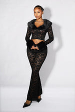 Long sleeve floral lace top featuring a plunging neckline and soft faux fur trim on the collar and cuffs Matching high waist, flare leg pants featuring a built in shorts lining Top length 16.4"(S) Pants length 40.4"(S) Pants inseam 31.6"(S)...