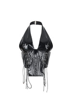 Sleeveless open back halter top with gold metal trim featuring foil metallic material Length 18.3"(S) Back tie closure We recommend wearing pasties, a strapless bra, or no bra with this garment Runs true to size Please note: Colour may vary...