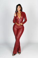 Motorcycle faux leather jacket featuring a front zip closure and a slim fit for a classic, edgy look Matching high rise pants set featuring a V shaped front hem at the waist Jacket length 17"(S) Pants length 44.2"(S) Inseam 34.2"(S)...