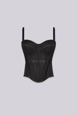 Sheer mesh corset bustier featuring boning for a clean, structured shape Finished with a mid strap line detail that accentuates the waist and adds edge Length 12"(Size S) Back hook closure We recommend wearing pasties or going braless with this...