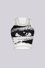 Eye graphic knit sleeveless crop top Wide armholes with a racerback design Slip on closure Length 16.5"(Size S) Runs true to size We recommend wearing pasties or going braless with this style Please note: Colour may vary slightly due to...
