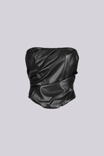 Strapless faux leather tube top featuring ruching details and silicone gel for a secure fit Double lining Length 14"(S) Side zipper closure We recommend wearing pasties, a strapless bra, or no bra with this garment Runs true to size Please...
