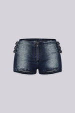 High rise dark blue denim shorts featuring five pocket styling and zippered back pockets Length 10.2"(Size S) Fly button and zipper closure Runs true to size Please note: Colour may vary slightly due to lighting. Product images without a model...