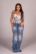 Bold layered jeans featuring distressed raw edge trim and metallic buttons High waisted fit flatters Length 43"/ Inseam 32"(Size S) Fly button and zipper closure Runs true to size Please note: Colour may vary slightly due to lighting. Product images without...