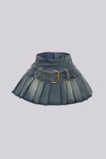 Low rise denim micro pleated skirt featuring front slit and removable belt design Front zipper closure Runs true to size