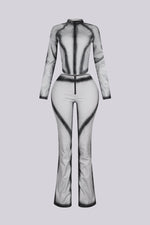 Mesh print tube top with a styling ready scarf Matching high waist pants set Top length 7"(S) Pants length 49.6"(S) Pants inseam 34.6"(S) Pull on closure We recommend wearing pasties or no bra with this garment Runs true to size