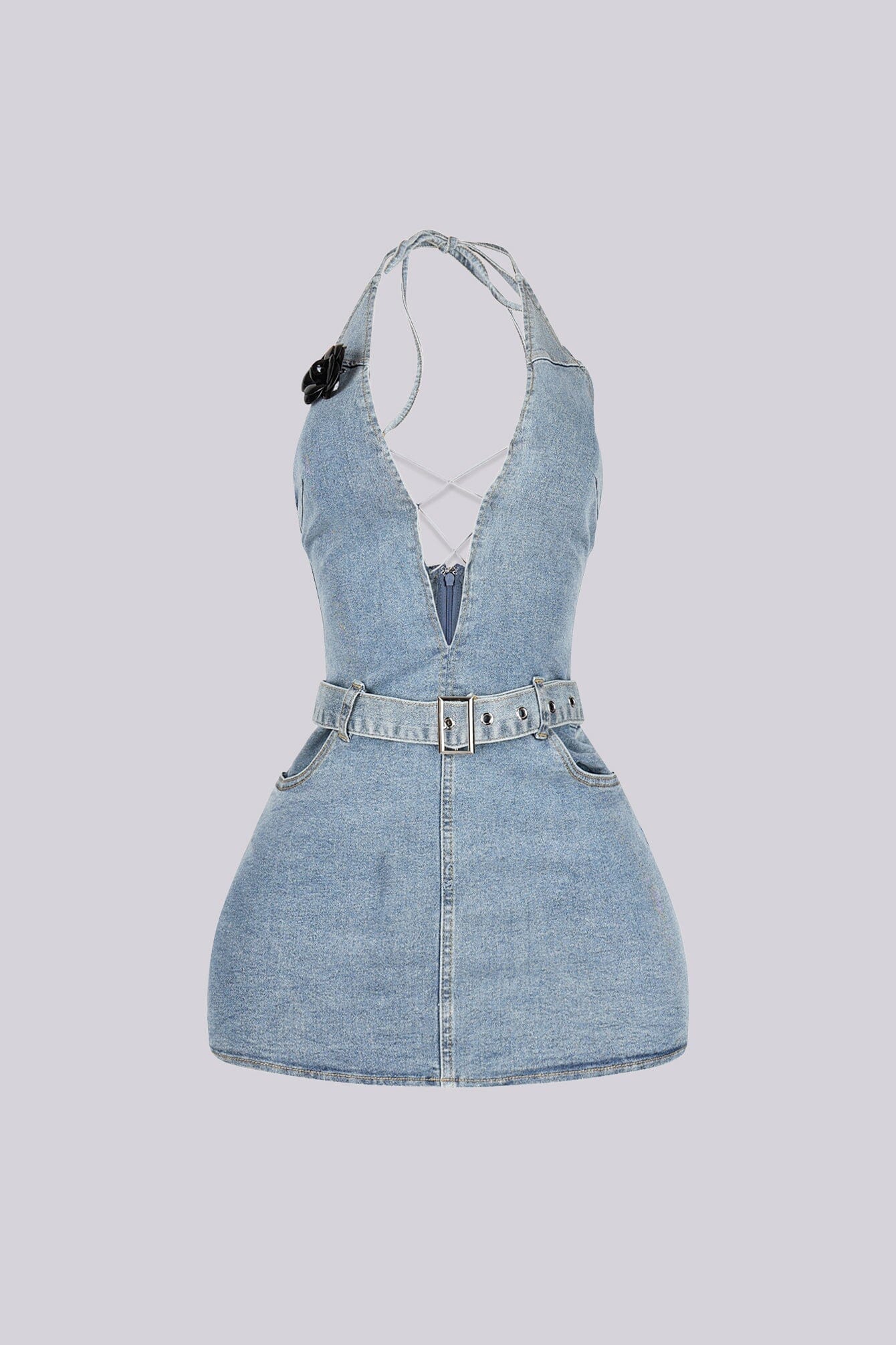 Washed denim halter mini dress featuring a detachable belt and functional pockets