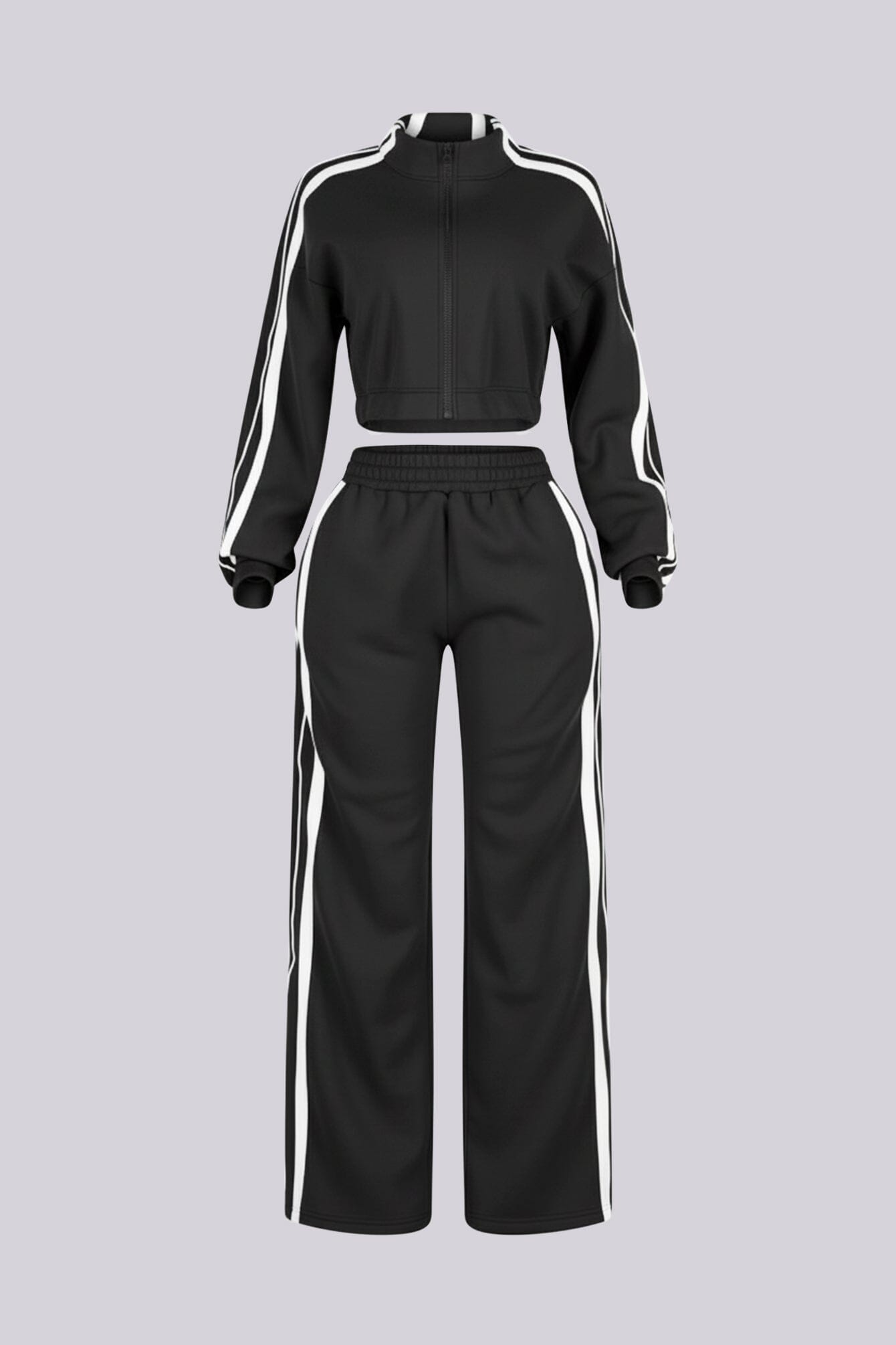Unisex style crop jacket featuring a high neck collar and stripes on the sleeves