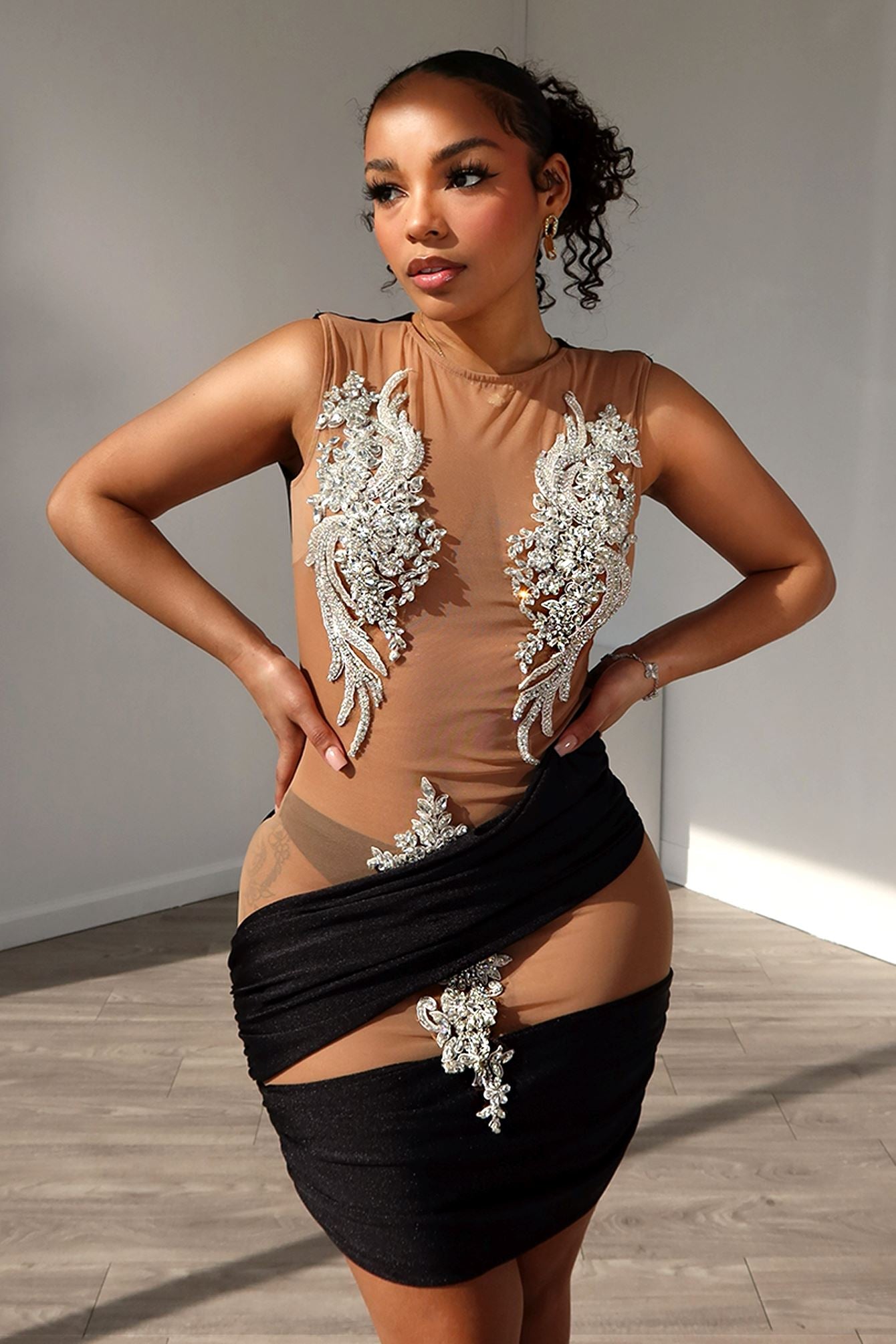 Sleeveless mini dress featuring mesh contrast detail with rhinestone front detail