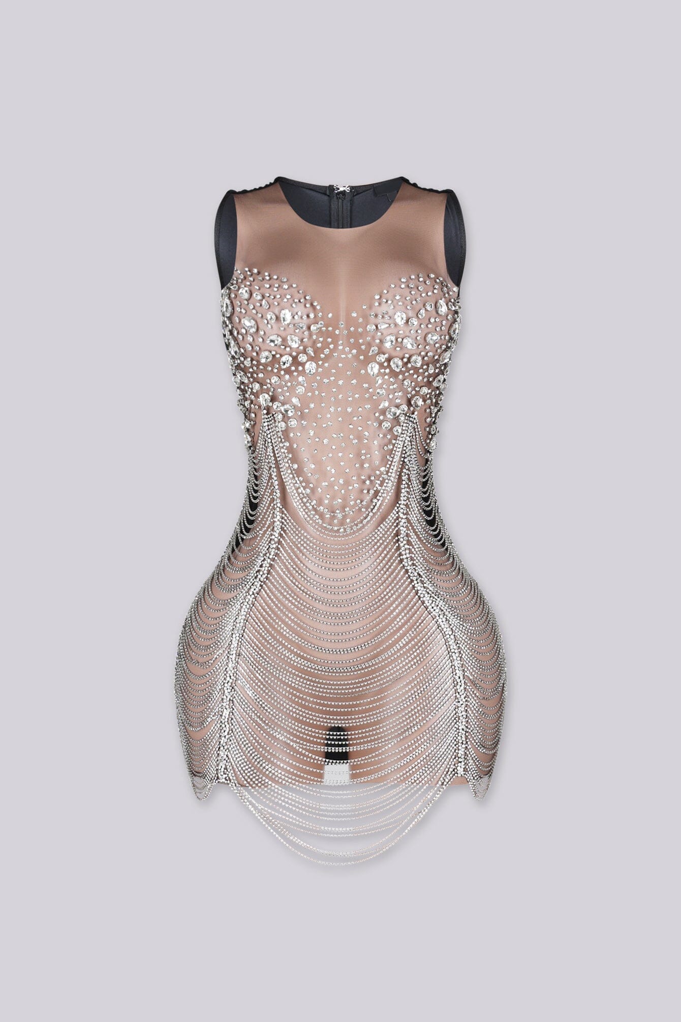 Sleeveless mesh mini dress featuring rhinestone embellishments on the front and a smooth satin back for an elegant contrast