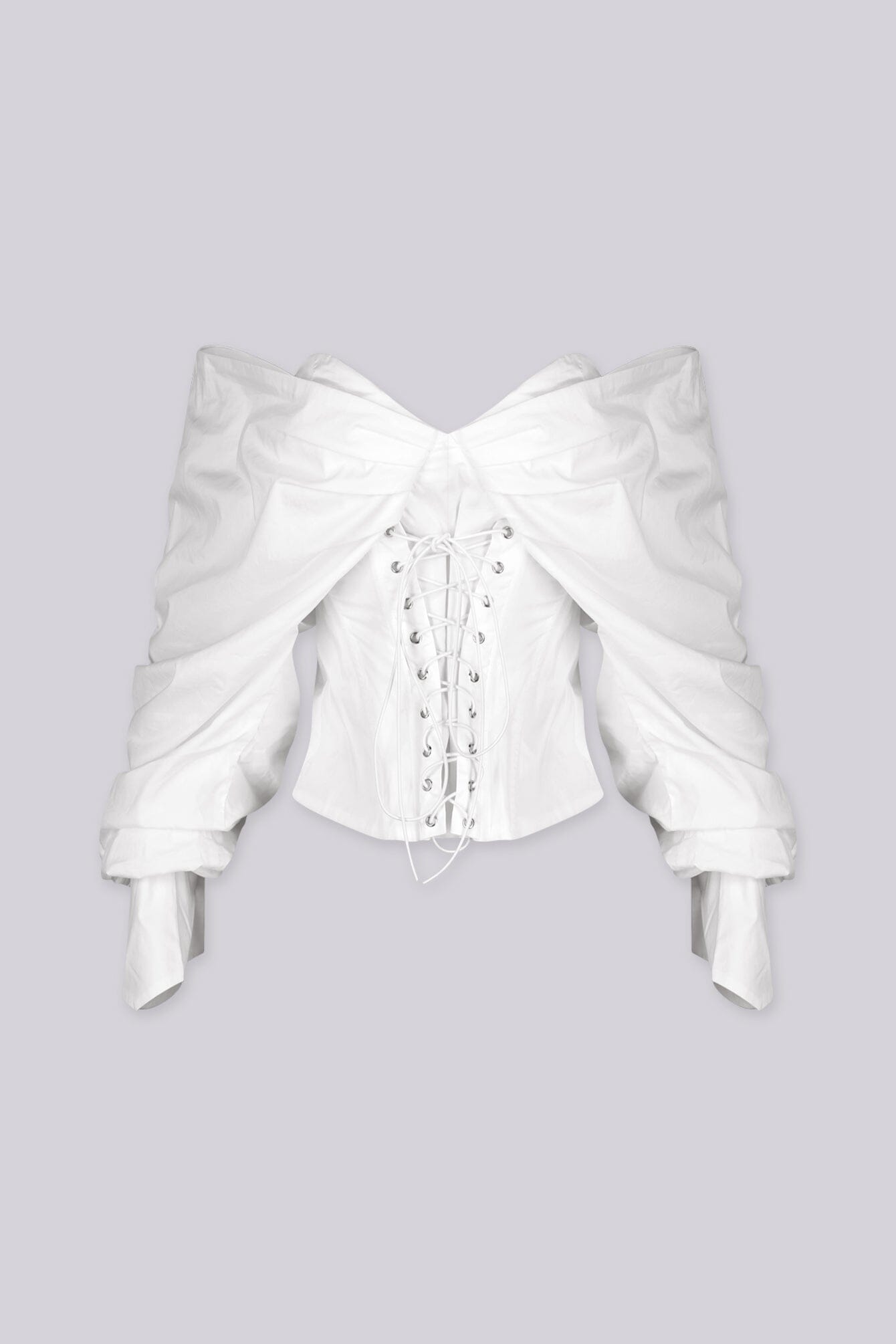 Off shoulder long sleeve blouse top with a structured front corset fit