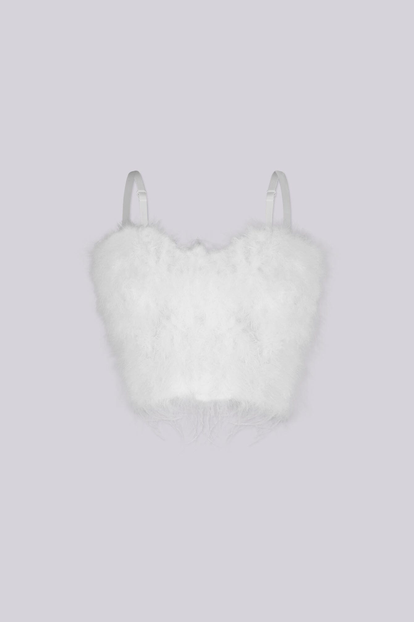 Tailored mesh corset bustier featuring detachable straps and elegant faux fur detailing