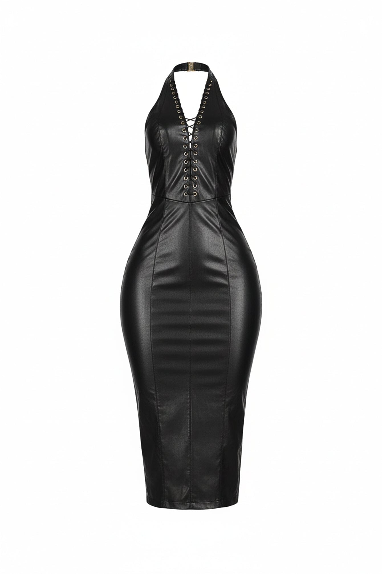 Sleeveless faux leather halter midi dress featuring eyelet lace up details and back slit