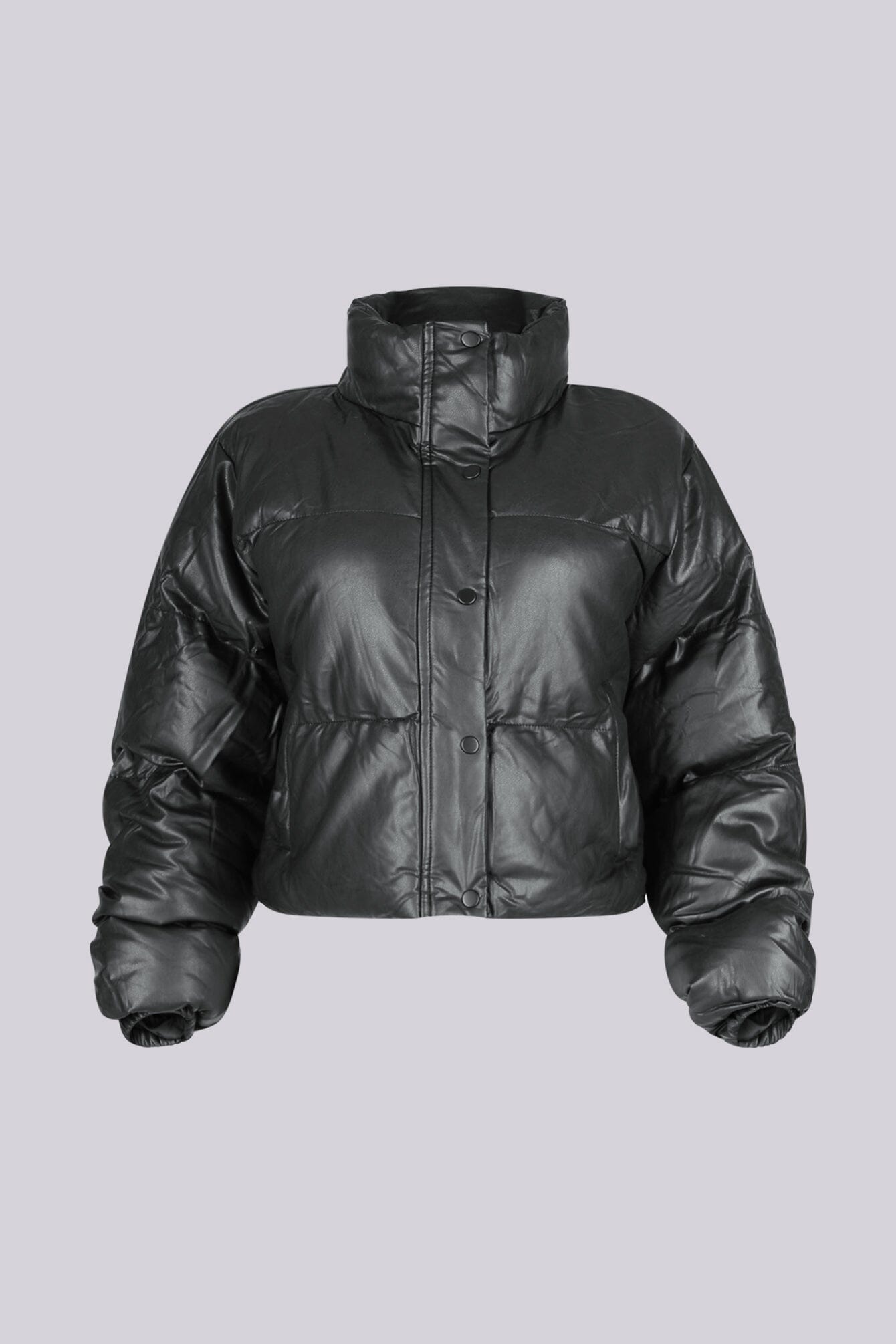 Faux leather puffer jacket featuring a high neck, adjustable drawstring waist, and functional pockets