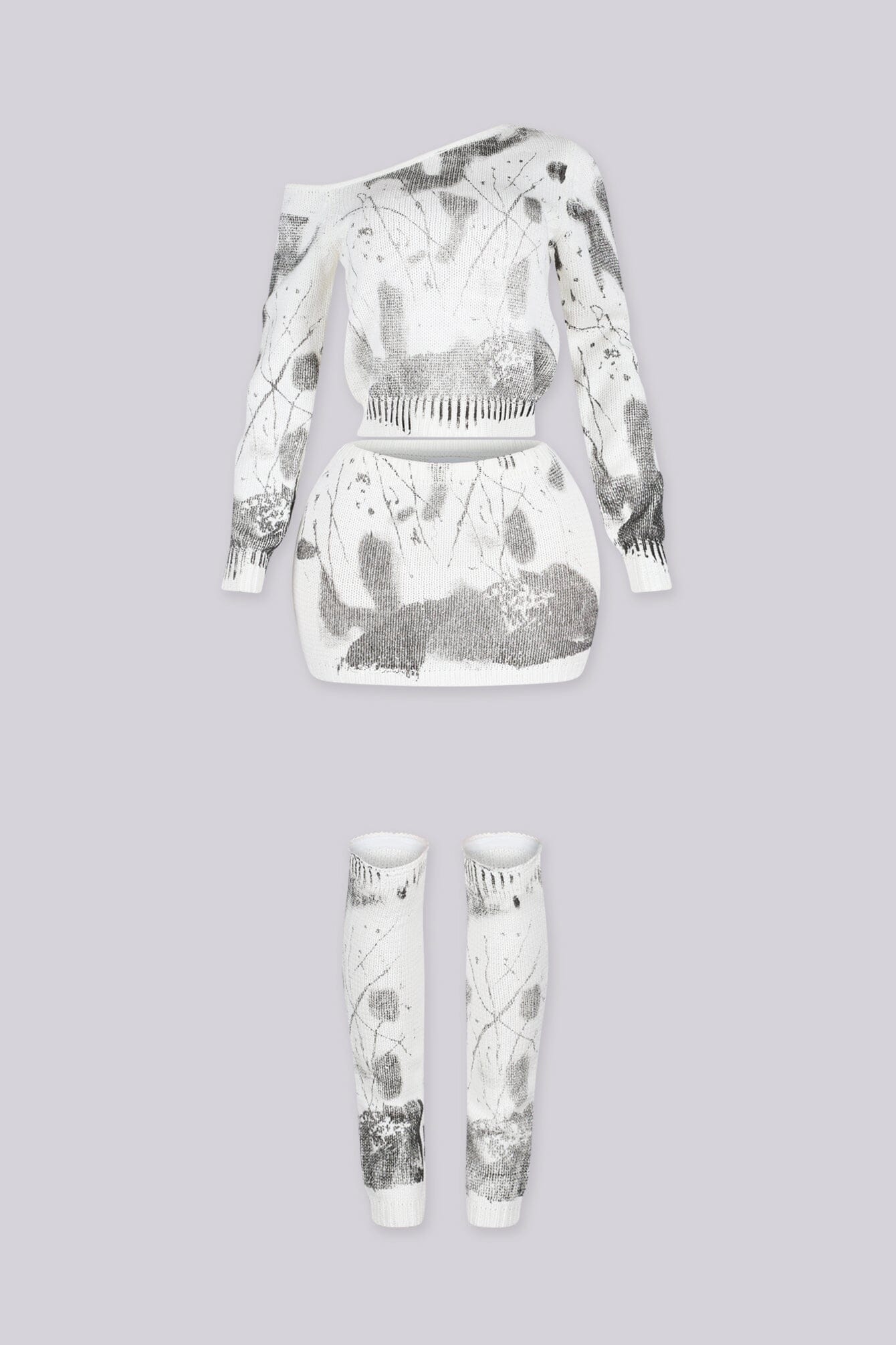 Long sleeve knit printed top featuring an asymmetrical neck line