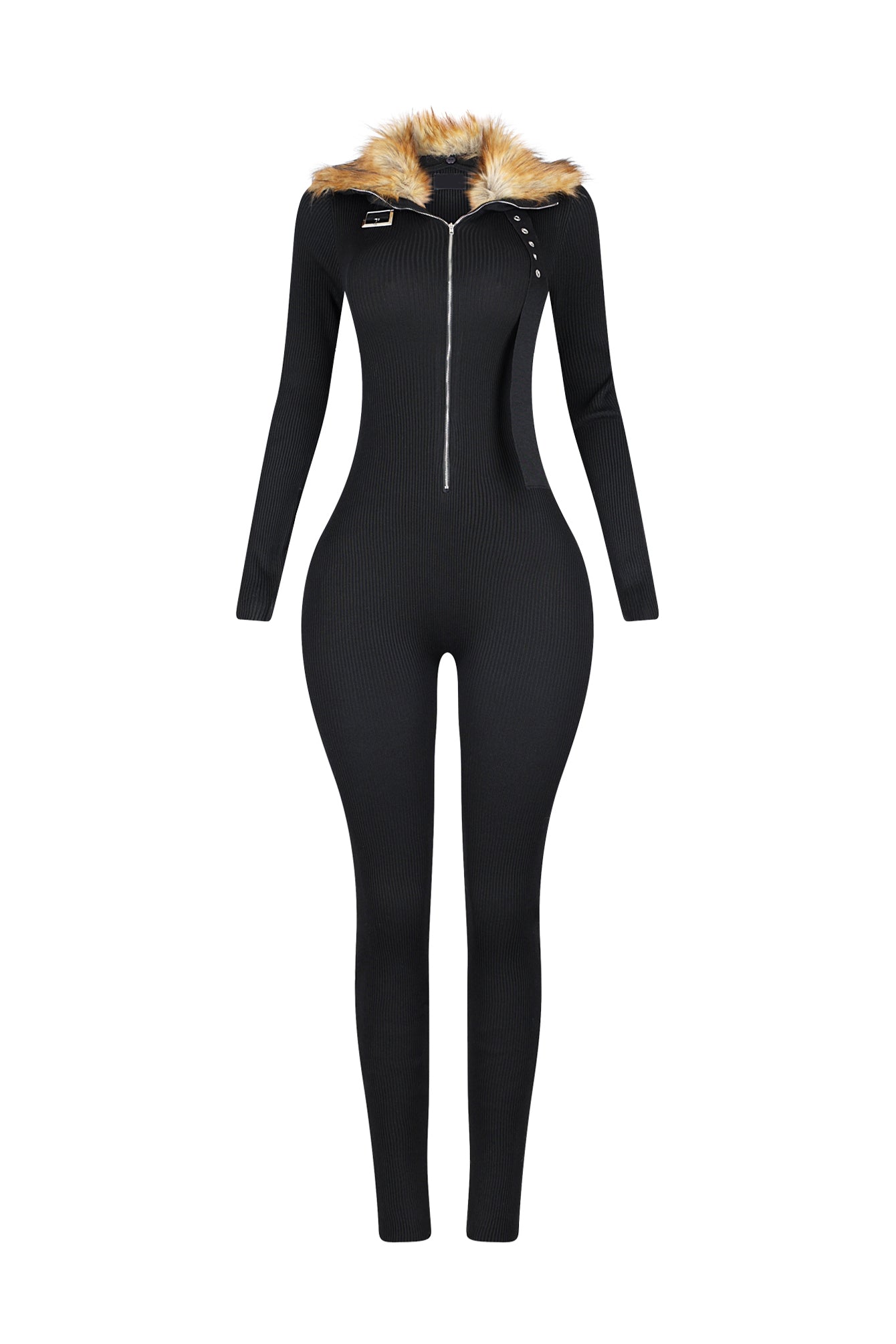 Long sleeve ribbed knit jumpsuit featuring front zipper details with a buckle and a detachable fur collar