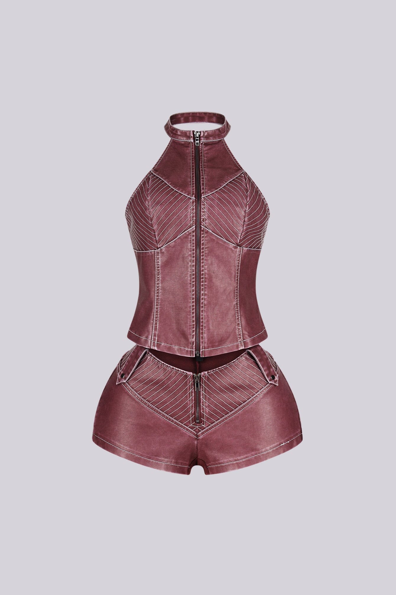 Sleeveless faux leather halter top featuring stretch back detail and front zip closure