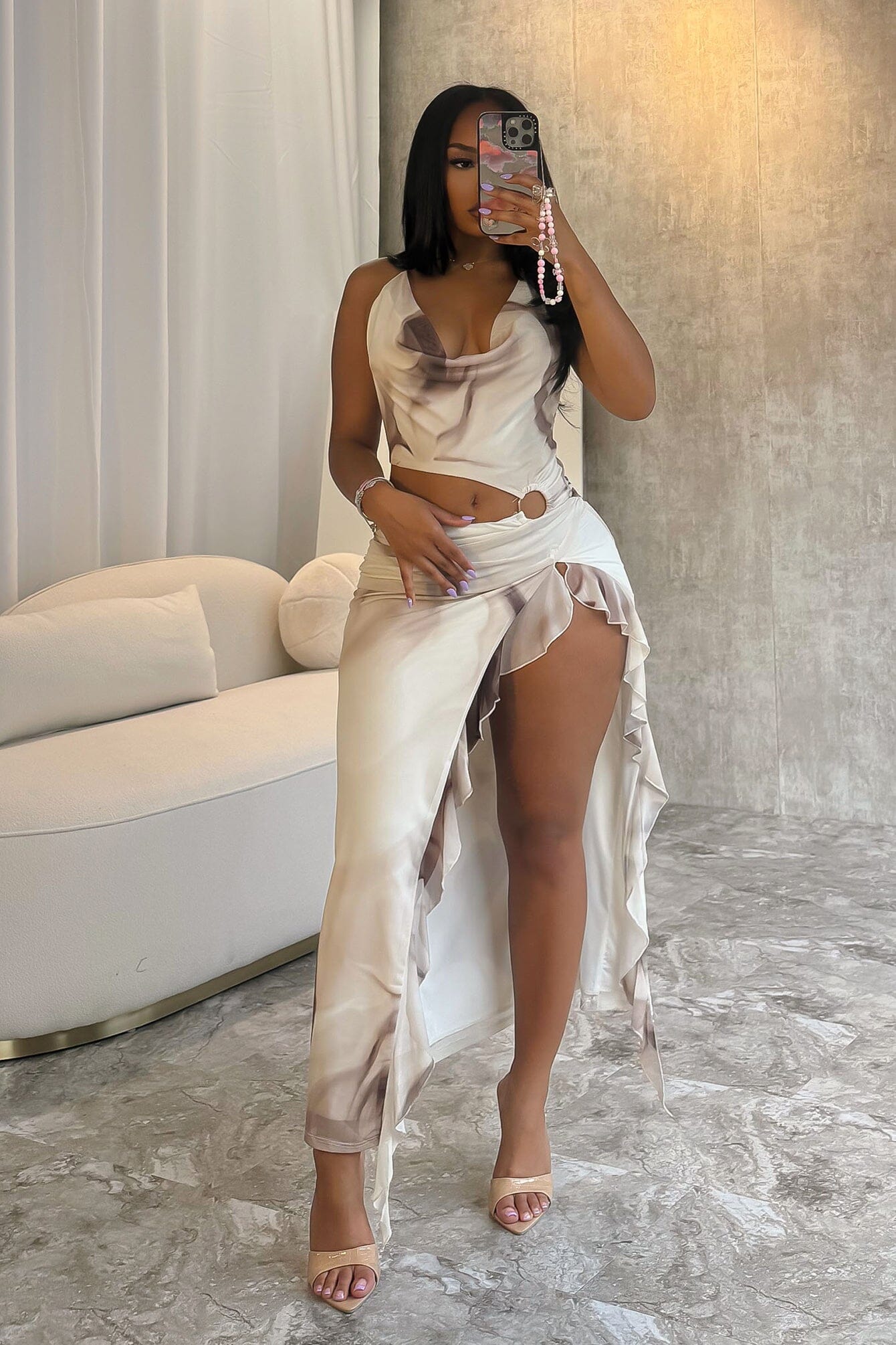 Print mesh cowl neck long dress featuring cutout detail with O ring trim and asymmetrical ruffle hem slit