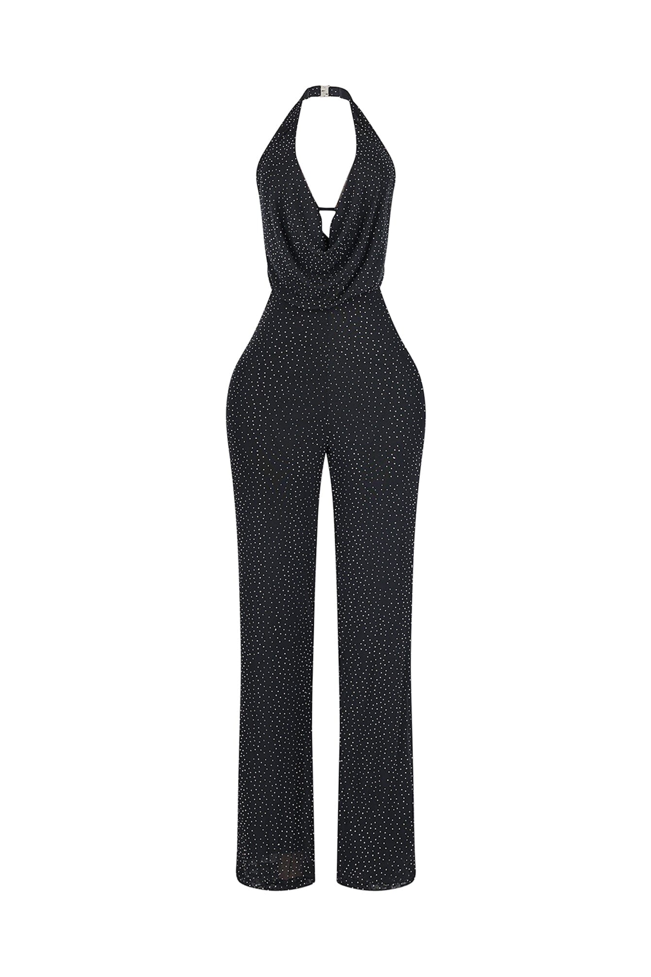 Mesh rhinestone halter jumpsuit featuring all over rhinestone embellishments and cowl neck design