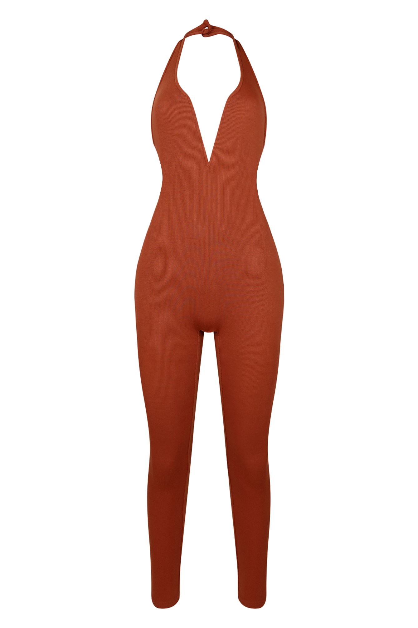 Halter neck skinny leg ribbed jumpsuit featuring front deep V wired and open back detail