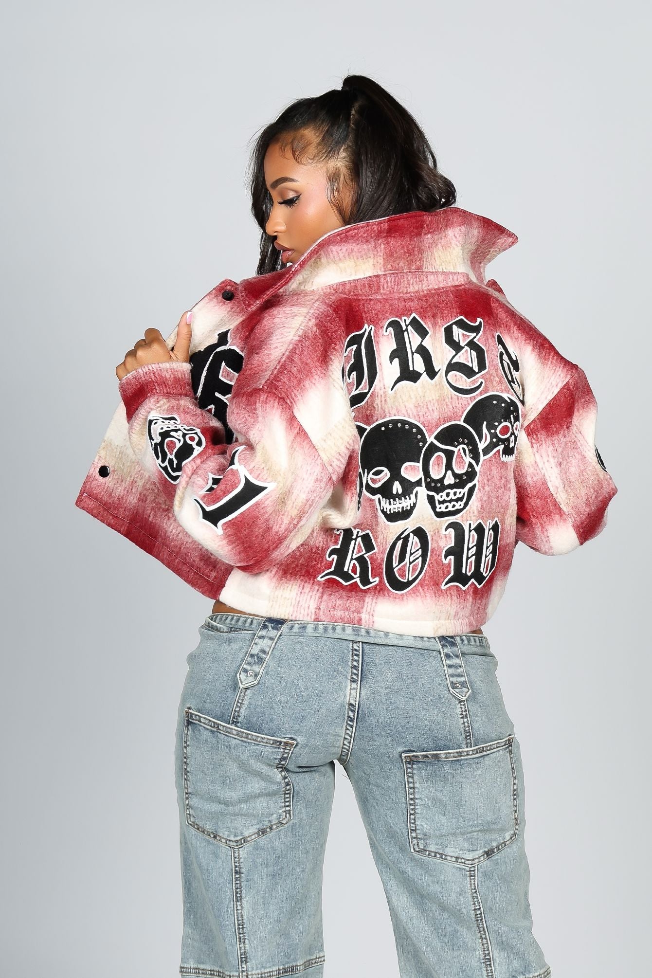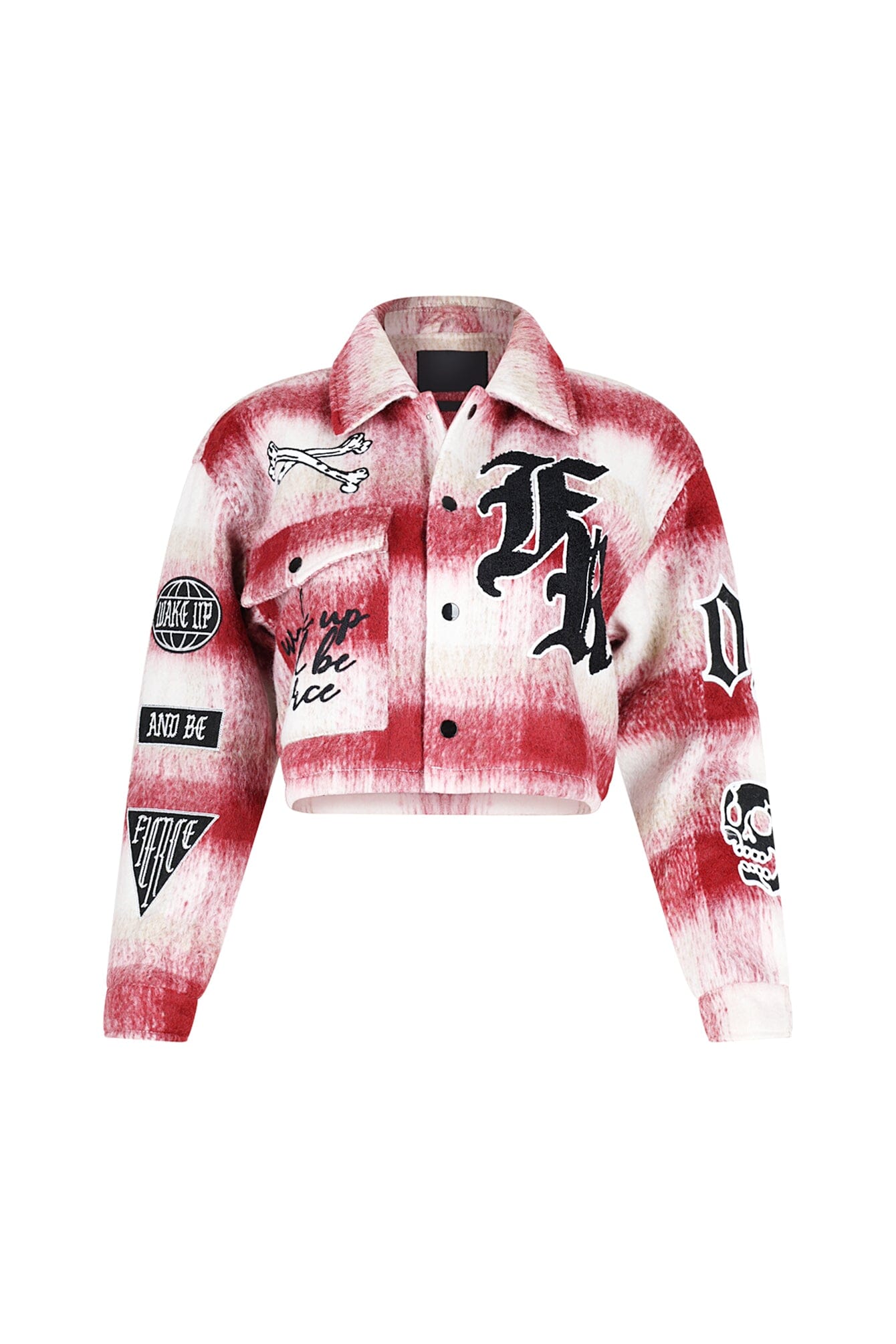Streetwear style cropped jacket featuring multiple patch details on the front and skull graphics on the back