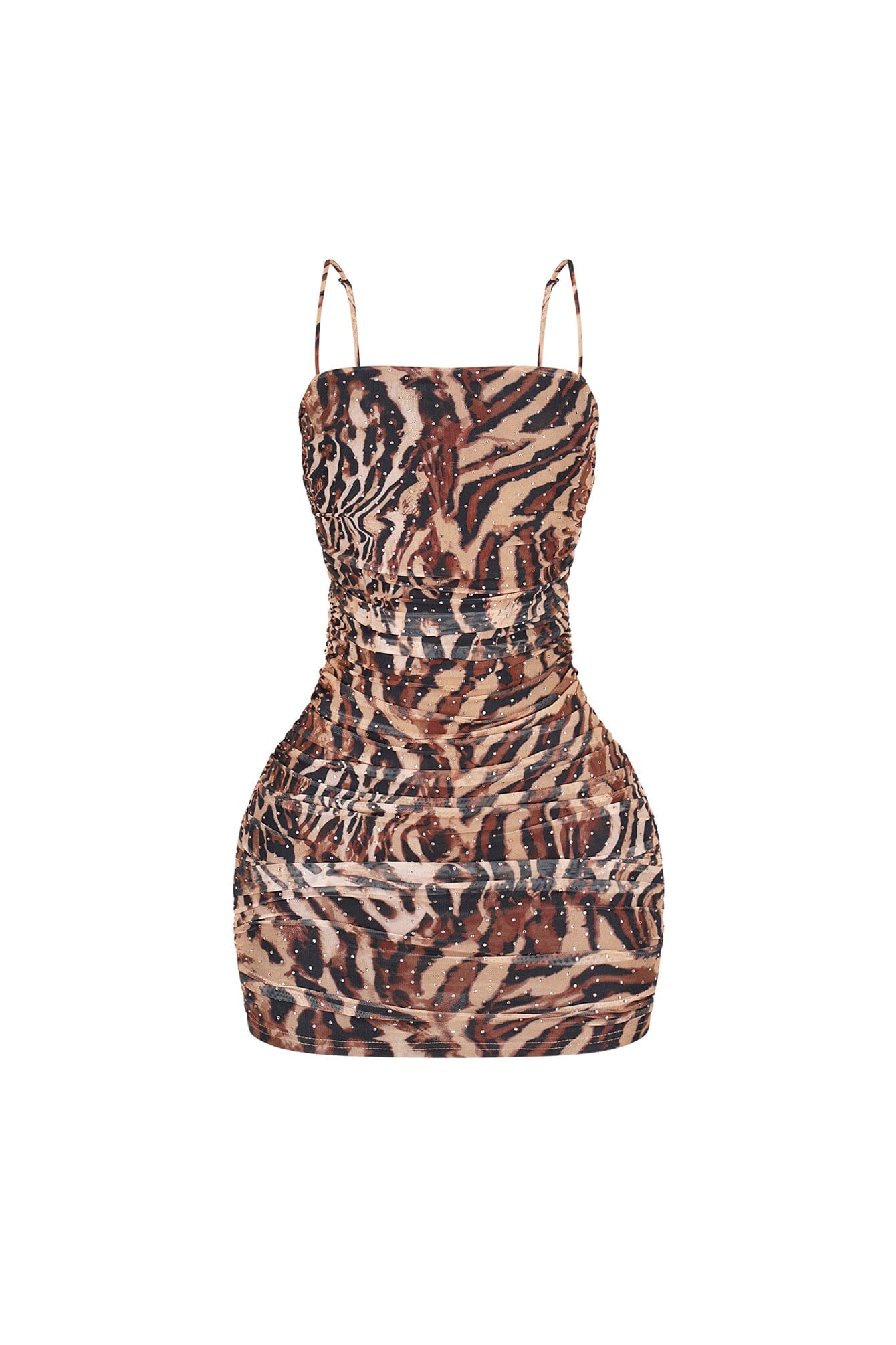 Mesh leopard print ruched mini dress featuring all over rhinestone embellishments