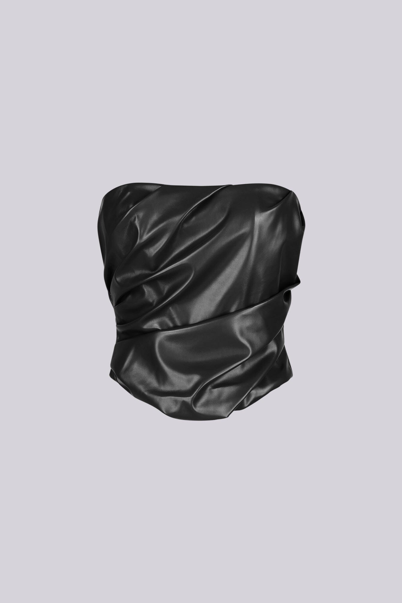 Strapless faux leather tube top featuring ruching details and silicone gel for a secure fit