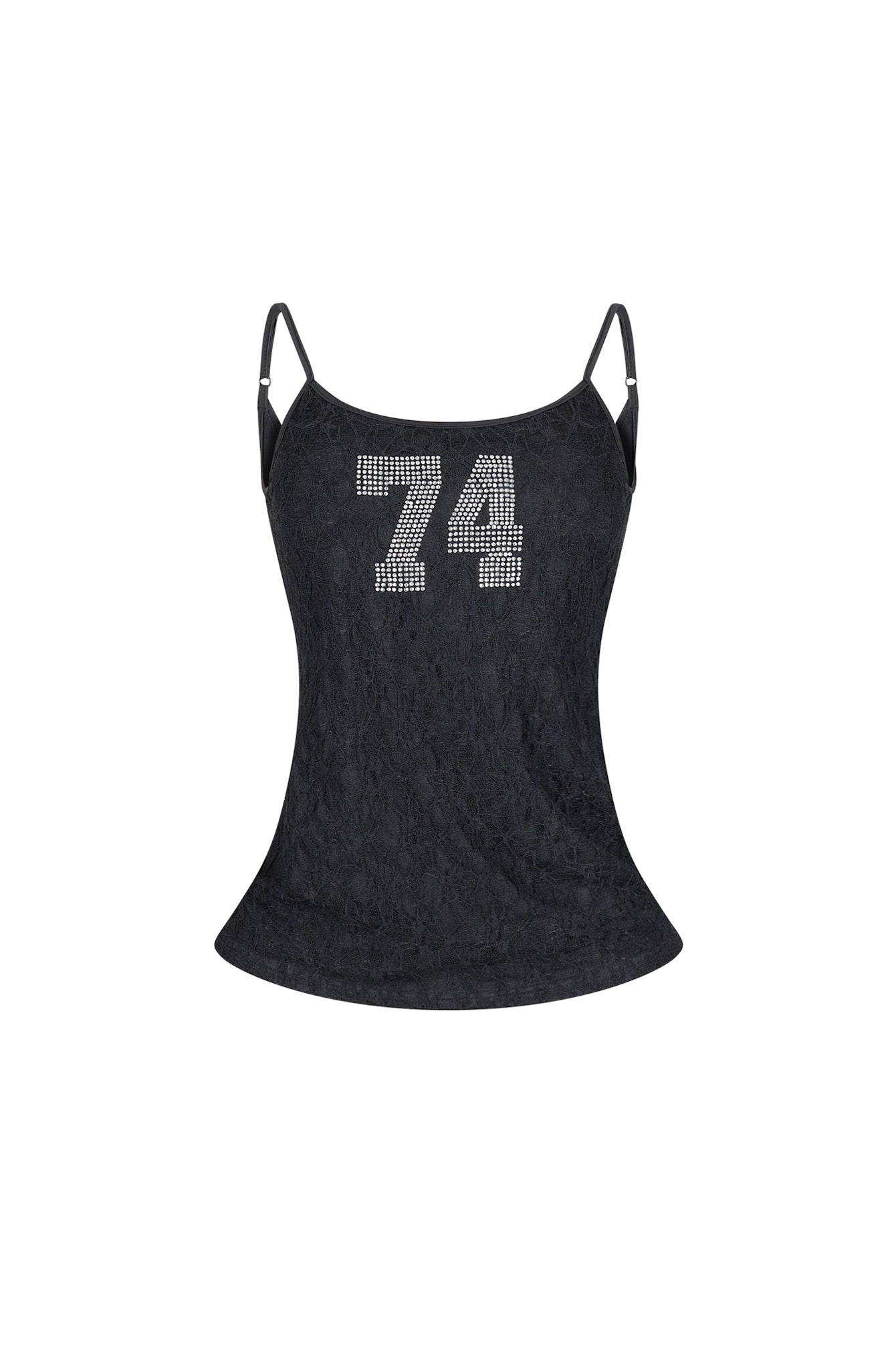 Sleeveless all over lace tank top featuring a rhinestone graphic on the front and back lace up details